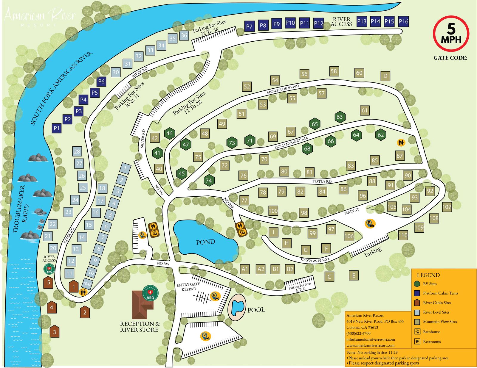 American River Resort is situated on a bend of the South Fork of the American River. The resort is 30 acres of oak-forested property. There are 85 campsites, 25 with full RV hookups, 6 Deluxe Cabins and 9 River Front Platform Cabin Tents.